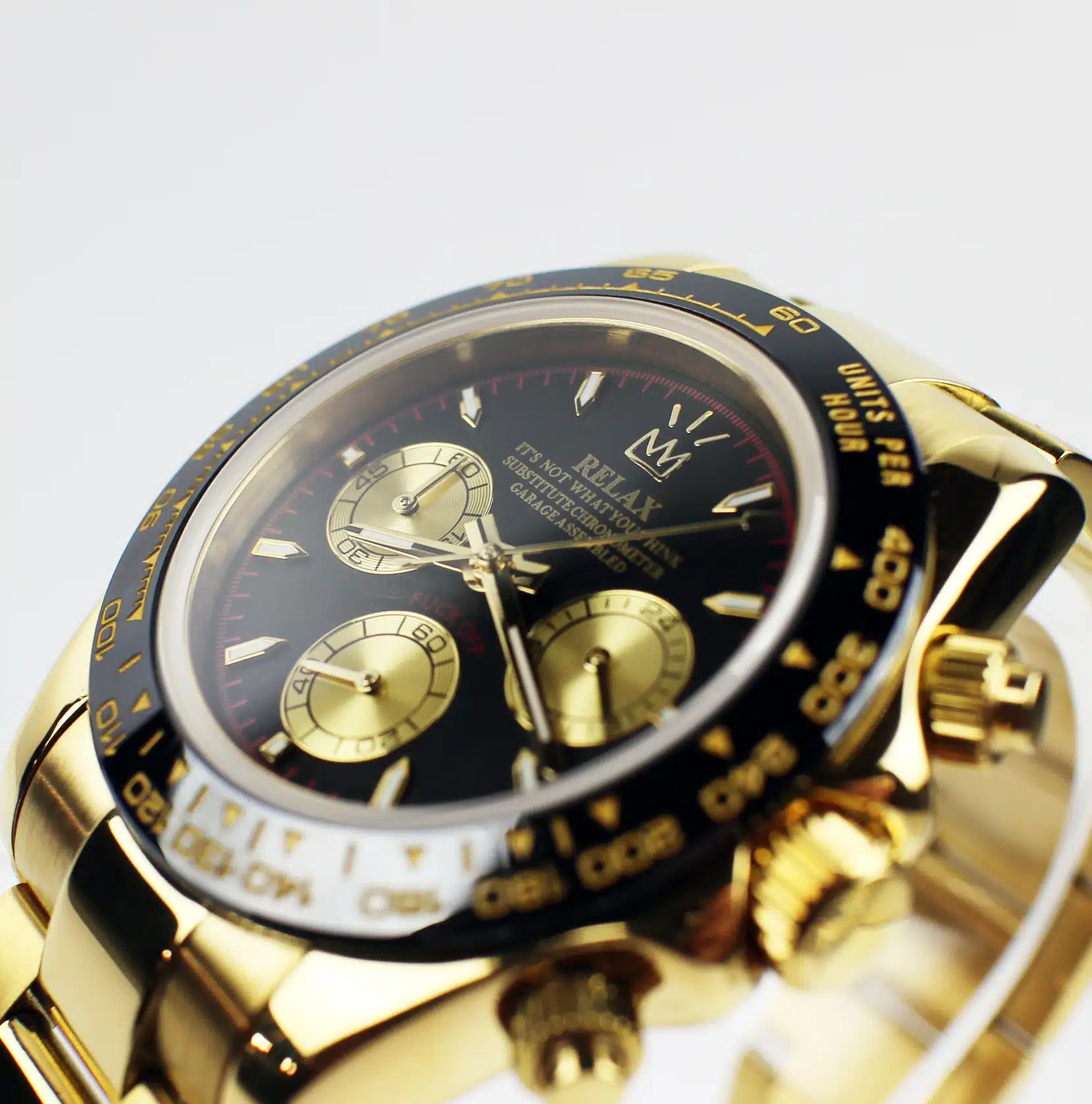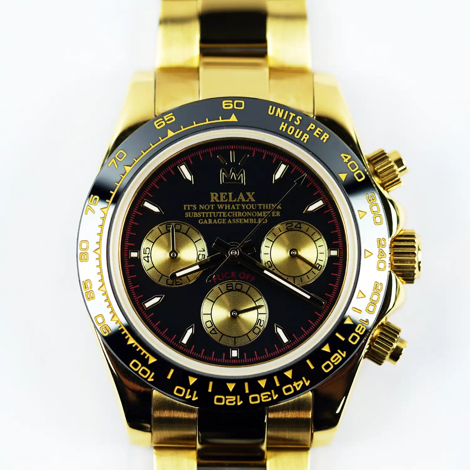 Yellow Gold PVD with Glossy Black Dial with Gold Subdials. The red text on the bottom reads “F*CK OFF”. If a situation requires it, you can just say that you were reading it off the watch dial…