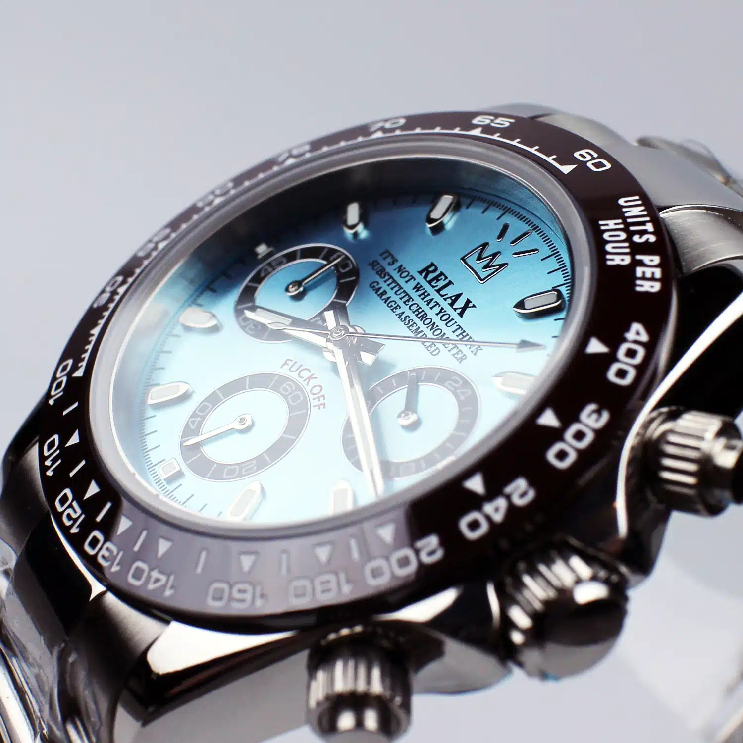 Steel Chronograph with Sky Blue Dial and Brown Bezel. The red text on the bottom reads “F*CK OFF”. If a situation requires it, you can just say that you were reading it off the watch dial…
